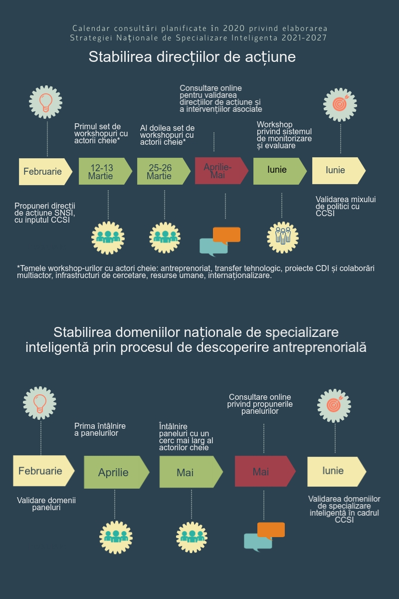 Comitetului de Coordonare privind Specializarea Inteligentă (CCSI), constituit prin Ordinul MCI nr. 458/31.07.2019, care cuprinde reprezentanți ai diverselor ministere și ai Agențiilor de Dezvoltare Regională. Începând cu luna septembrie 2019 au loc consultări periodice în cadrul acestui comitet, iar în perioada martie-iunie 2020 sunt prevăzute consultările extinse cu actorii cheie (